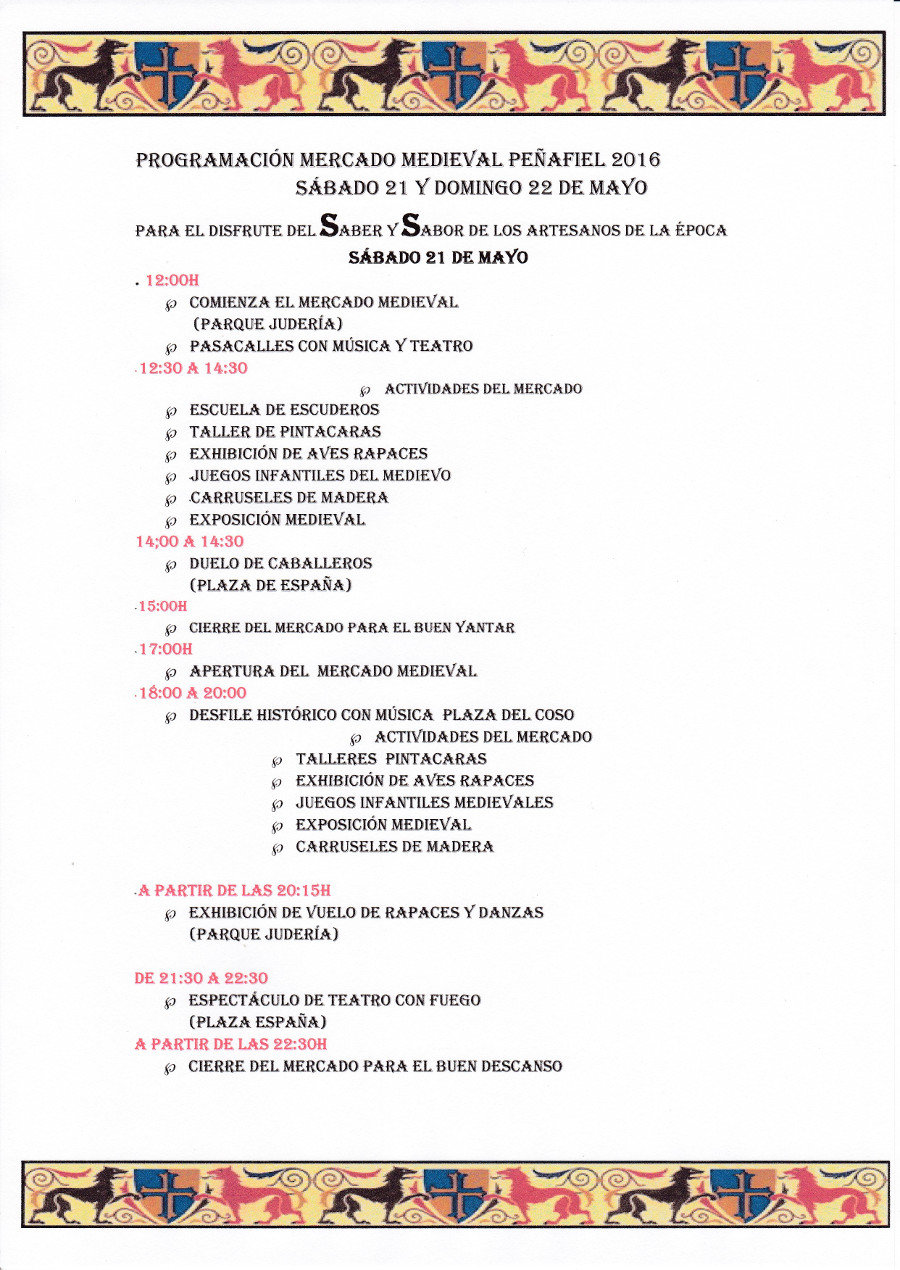 Asimismo se celebrará en el Parque de la Judería el Mercado Medieval con: pasacalles con música y teatro, pintacaras, duelo de caballeros, juegos infantiles medievales, exhibición de vuelo de aves rapaces y danzas etc.