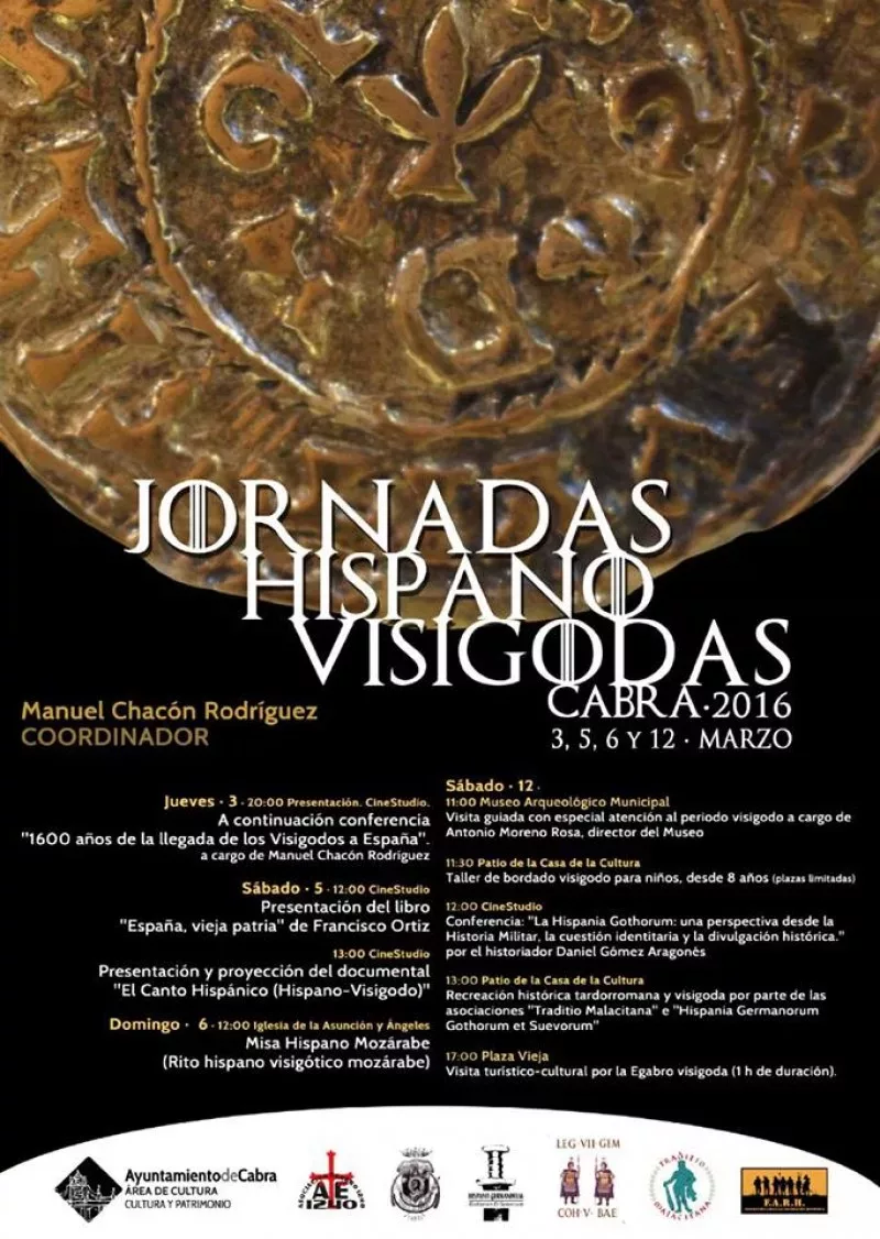 La asociación Egabro 1240 de la ciudad de Cabra (Córdoba) ha organizado unas jornadas dedicadas a conocer, divulgar y valorar la historia visigoda aprovechando los 1.600 años que se están cumpliendo de la llegada de los visigodos a España. Bajo el título Jornadas Hispano-Visigodas de Egabro, tendrán lugar los días 3, 5, 6 y 12 de marzo. Están coordinadas por Manuel Chacón Rodríguez y tiene como principal objetivo poner en valor la historia de los visigodos en España en sentido general y en la localidad de Cabra, haciendo hincapié en el obispado y condado de Egabro (siglos III-VIII dC) y los tiempos mozárabes de San Rodrigo Mártir (s. IX-X).