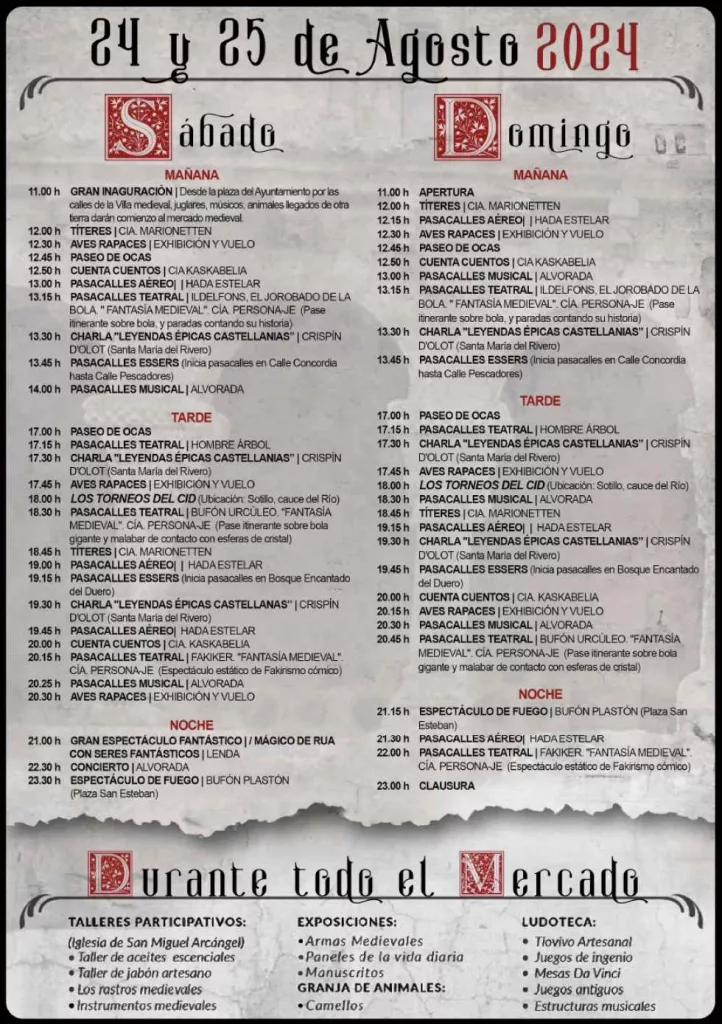 Espectáculos itinerantes de música, teatro para todos los públicos, cuentacuentos, espectáculos de fuego o seres mitológicos animarán durante todo el fin de semana del 24 y 25 de agosto, acompañados por las ya tradicionales justas y torneos a caballo, uno de los grandes espectáculos del evento, que tendrán lugar junto al puente de los 16 ojos, sobre el río Duero.