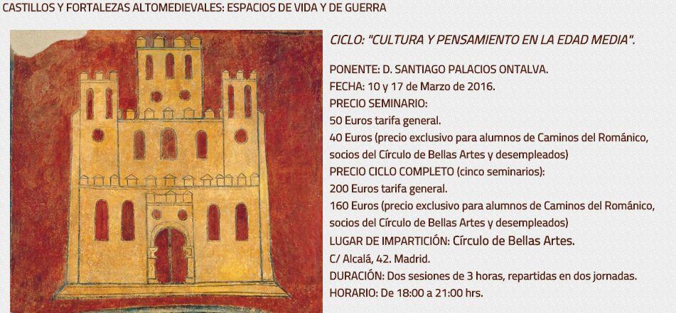 Los días 10 y 17 de marzo de 2016 se celebra el Seminario Castillos y fortalezas altomedievales: espacios de vida y de guerra en el Círculo de Bellas Artes de Madrid. El seminario será impartido por Santiago Palacios Ontalva. El seminario se inscribe dentro del ciclo Cultura y pensamiento en la Edad Media. El Círculo de Bellas Artes, en colaboración con Caminos del Románico, organiza este ciclo, formado por cinco seminarios, a través de los cuales, de la mano de un selecto grupo de expertos en el mundo medieval, podremos conocer en mayor profundidad el auténtico rostro de aquella sociedad, introducirnos en su día y a día y, por ende, recorrer las manifestaciones artísticas que formaron parte de la misma