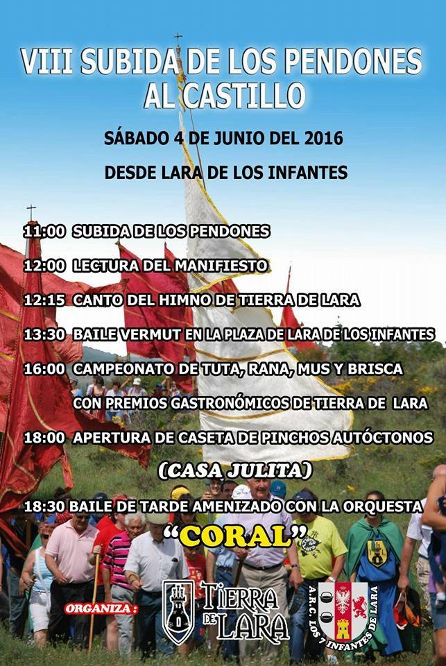 La asociación Tierra de Lara ha organizado la VIII Subida al Castillo de Lara. Tendrá lugar el sábado 4 de junio de 2016 y comenzará a las 11:00 en la localidad de Lara de los Infantes (Burgos). Como en otras ocasiones, gentes de toda la Tierra de Lara subirán al castillo con pendones para recordar y reivindicar la importancia de esta antigua y hoy arruinada fortaleza. A las 12:00 está prevista la lectura del tradicional manifiesto y a continuación el canto del Himno de Tierra de Lara.