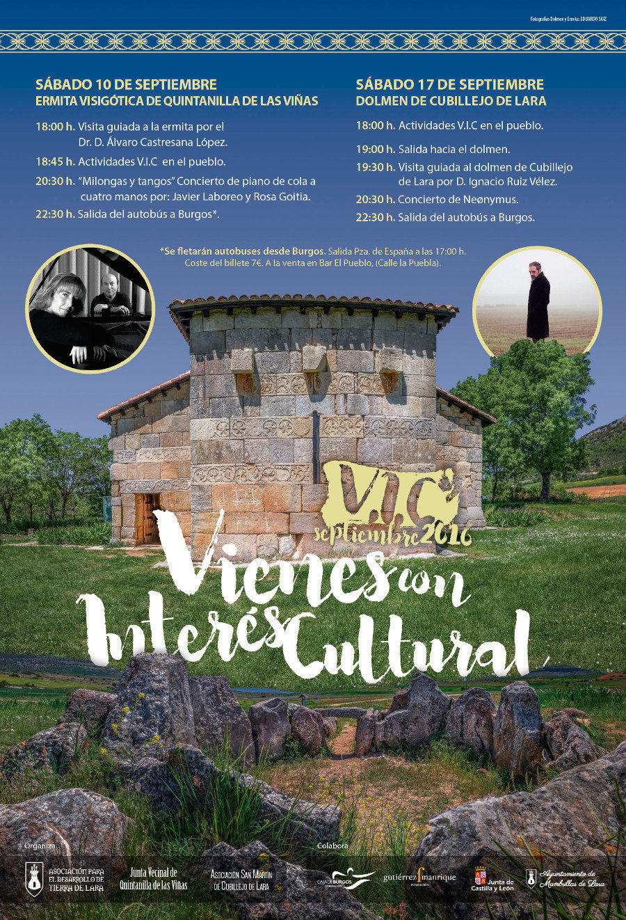 El sábado 10 de septiembre la Asociación para el Desarrollo de la Tierra de Lara ha organizado una visita guiada a la ermita visigótica de Santa María de Quintanilla de las Viñas. Comenzará a las 18.00 h. y la realizará el Dr. Álvaro Castresana López. Esta actividad se enmarca dentro de la iniciativa Vienes con Interés Cultural. Ese mismo día habrá actividades en el pueblo y un concierto de música: Milongas y tangos, concierto de piano a cuatro manos a cargo de Javier Laboreo y Rosa Goitia.