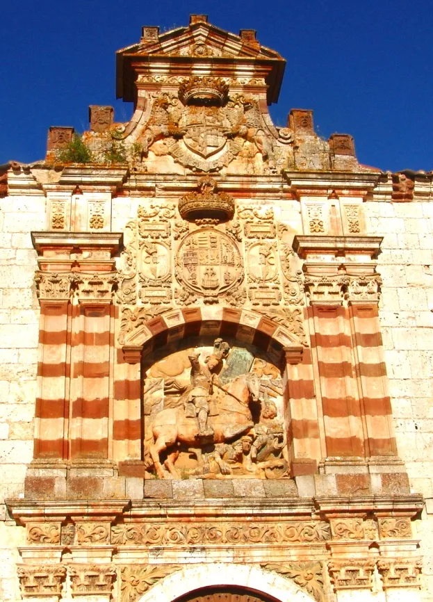 La reconquista está presente en la fachada principal del Monasterio de San Pedro de Cardeña, en Burgos, que tiene en su portada la sorprendente imagen del Cid a caballo y en actitud guerrera.