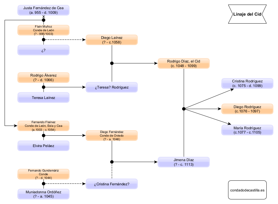 Según este esquema propuesto, el padre del Cid sería Diego Laínez, que hipotéticamente era hijo ilegítimo del conde Flaín Muñoz; y su madre, de nombre desconocido, era hija del noble Rodrigo Álvarez y Teresa Laínez.