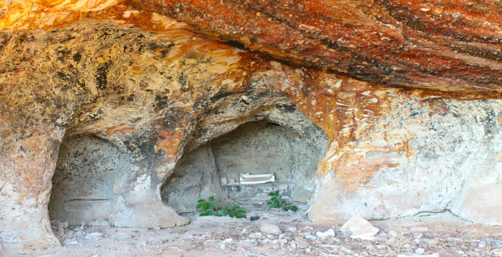 Ramón grande identifica un escarpe con varias cavidades artificiales. Una de ellas de nueve metros y medio de longitud por seis y medio de ancho parece que hubiera tenido dos vanos de accesos. Desde esta cueva se accede a otra cavidad con indicios de haber sido un centro de culto con restos de entalladuras, alguna cruz grabada y restos de enlucido.