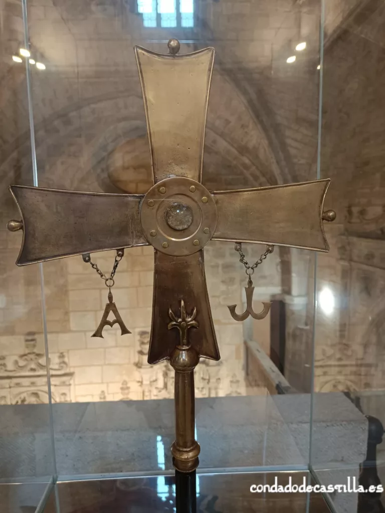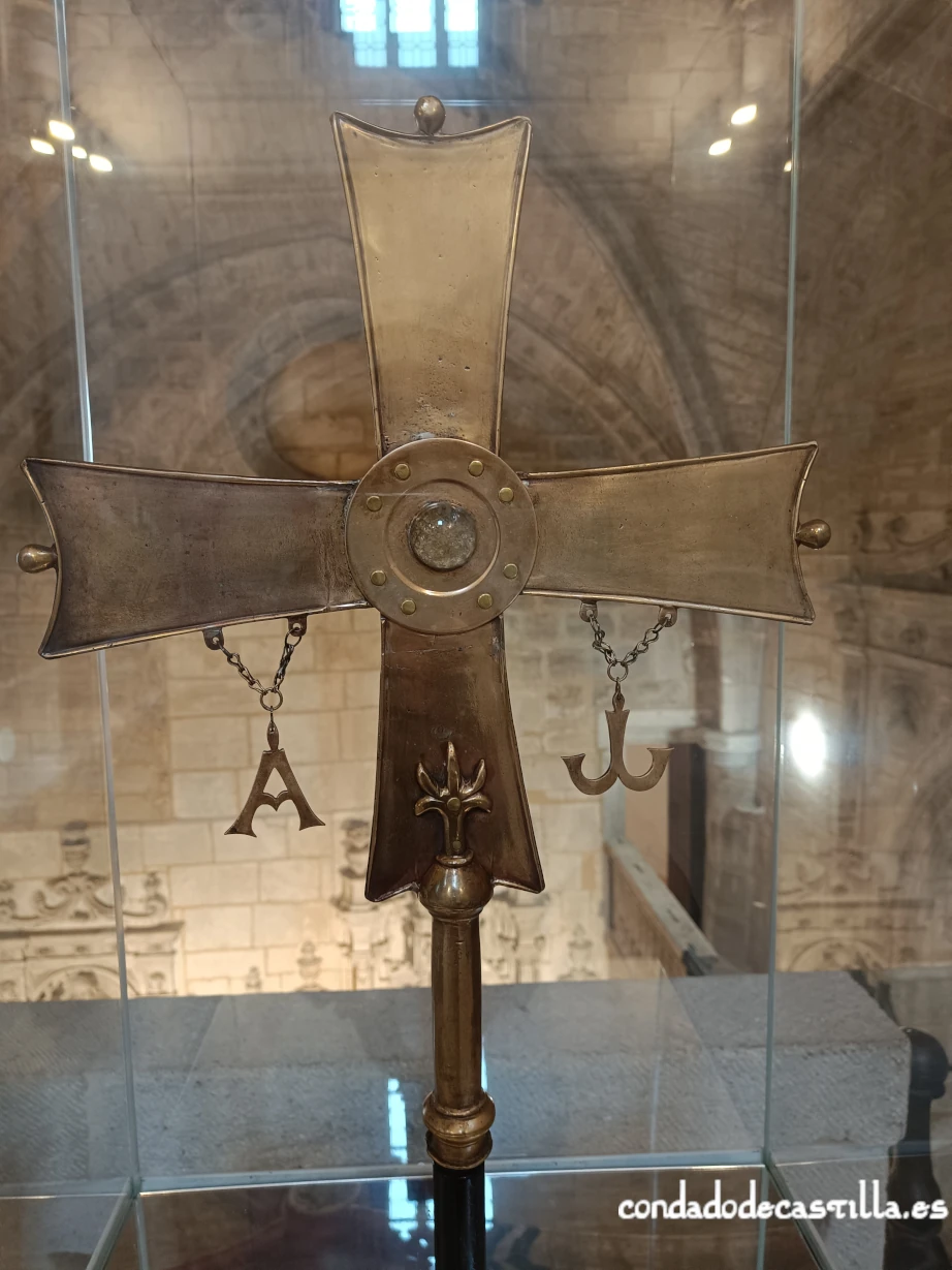 Lo más distintivo de esta cruz son los elementos que penden de sus brazos transversales: De los brazos horizontales cuelgan, mediante pequeñas cadenas, las letras griegas Alfa y Omega. Representan a Cristo como el principio y el fin de todas las cosas (Apocalipsis 22:13). Es un motivo iconográfico constante en el arte visigodo y mozárabe (muy similar a la famosa Cruz de los Ángeles de Oviedo).