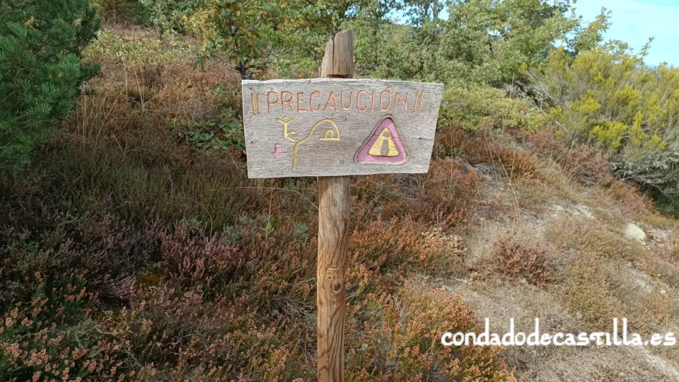 El eremitorio está bastante escondido. Es necesario subir a lo alto del afloramiento rocoso y buscar un cartel de peligro. Y es que el acceso al eremitorio esta justo al borde de un barranco de unos 10 m. de altura
