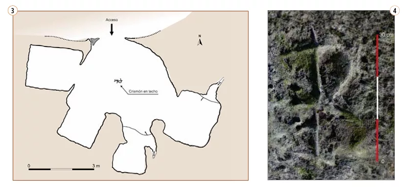 El techo de la sala central tiene forma de cúpula. Según Martínez Velasco, en el centro de dicha bóveda existe el grabado de una inscripción (de 31 x 19 cm. aprox.) en la que es posible reconocer una P seccionada a media altura por un trazo horizontal para generar una especie de cruz. La base de la letra P tiene otra línea que la cruza. Puede ser interpretado como un crismón.