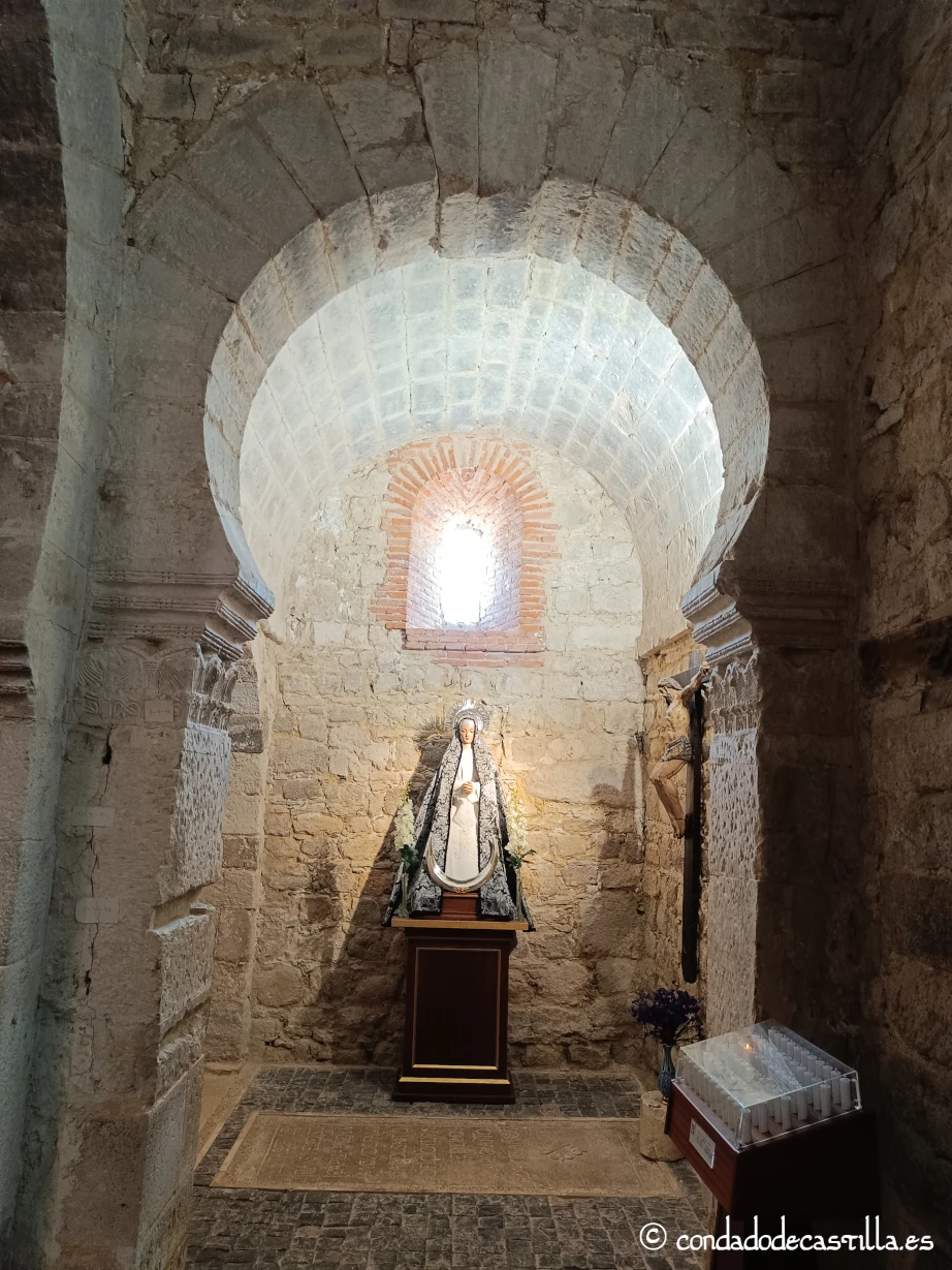 La capilla funeraria, conocida popularmente como “osario” o “cripta”, es uno de los espacios más singulares y aterradores de la iglesia. A ella se accede a través del ya mencionado arco de herradura de tradición prerrománica, situado en el lado del evangelio (norte) del templo.