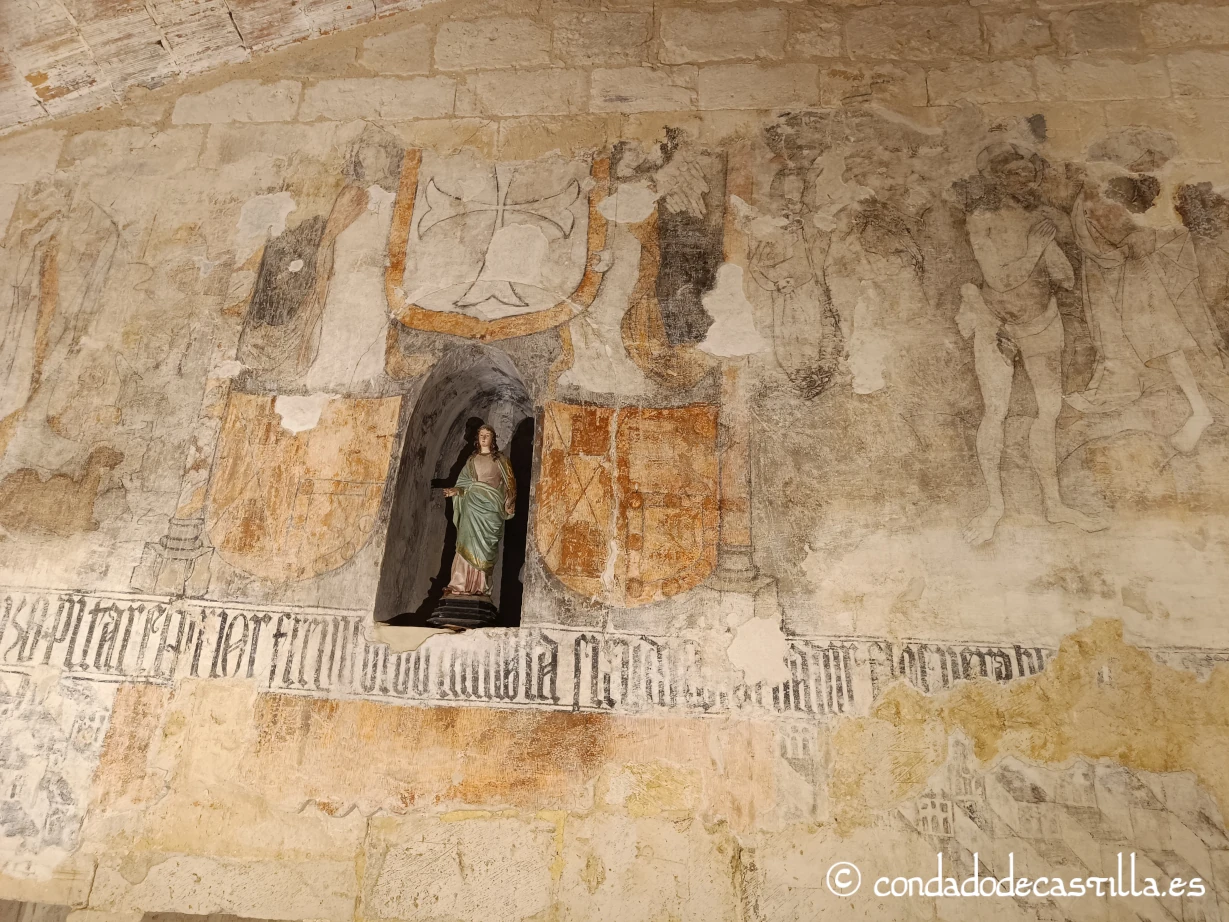 En sus muros se conservan restos de pinturas murales al fresco. Aunque están muy deterioradas, se pueden distinguir algunas figuras y motivos. A menudo se les atribuye una estética tardo-románica o gótica, y su existencia demuestra que, a diferencia de otras partes del templo, este espacio sí fue ricamente decorado.
