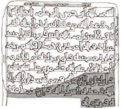 Está escrita en caracteres cúficos simples en relieve, muy erosionados, y tienen 5 líneas completas y 3 incompletas. Conserva parte de una dorno en su alrededor a modo de cenefa trenzada de doble cinta.