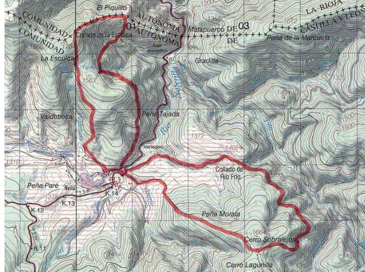 El recorrido de este sendero circular es: Neila – Fuente de Valdehesa – Collado de la Esculca  – Peña Tejada  – Collado de Rio Frío  – Cerro Sobralejos – Peña Morata -Neila.