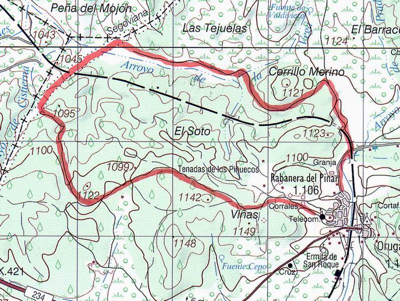 El recorrido de este sendero circular es: Rabanera del Pinar – Alto del Peral – Chozo Cerrillo Merino – Santa Marta – Piedras del Castellano – Cañada Real Segoviana – Tres Marías –  Vallejo de los Espinos – Cerro de Umbrías – Rabanera del Pinar