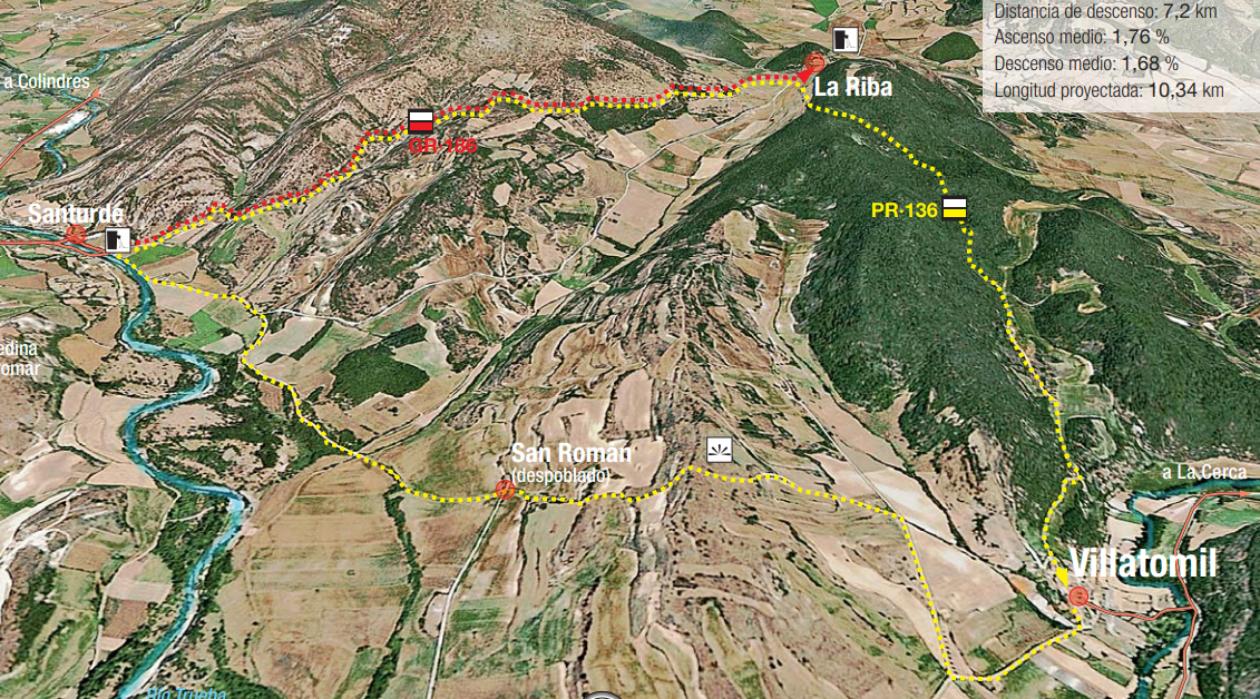 Este sendero circular une las pequeñas poblaciones de Villatomil, La Riba y Santurde, donde se pueden observar buenas casas típicas de esta zona. En el trayecto atravesaremos bosques de encinas y quejigos entre los Montes de los Tres Concejos, El Calero y El Corralón. En el camino de Santurde a Villatomil se atraviesa el Alto de San Román, donde se ubicaba el pueblo del mismo nombre del que ya nada queda.
