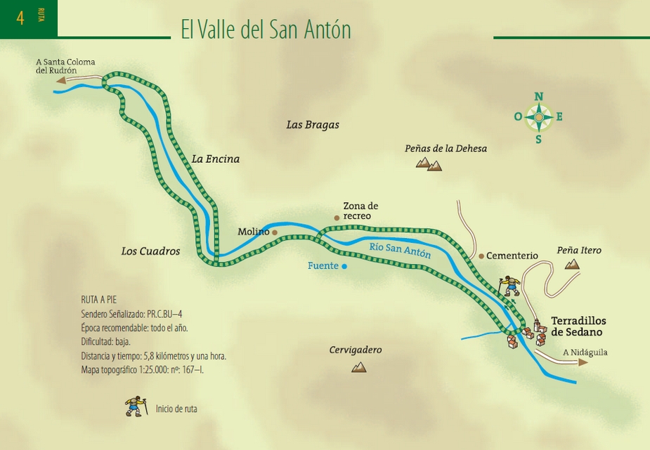 Sin ningún problema los andarines —la ruta también se puede realizar en bicicleta de montaña— podrán admirar la gran riqueza natural del Valle del San Antón y el valor de la arquitectura popular de la localidad donde se inicia y finaliza la ruta: Terradillos de Sedano. Hay que salir de este pueblo por el camino que se dirige hacia Santa Coloma del Rudrón. Con el río San Antón a la izquierda se pasa junto al cementerio de Terradillos de Sedano, que conserva una diminuta y curiosa ermita con restos románicos.